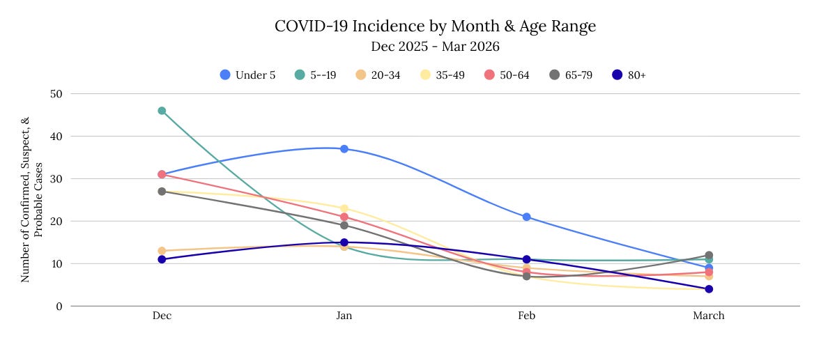 COVID-19 incidence appears to be trending downward regionally, as March received the fewest diagnoses of the past 4 months (n=55), a 62% decrease in incidence as compared to January of 2026. This is consistent with statewide data, which indicates that the incidence of emergency department visits due to COVID-19 in March were classified as very low, representing just 0.4% of visits. This year is following a similar trend as 2025, which saw a comparable decrease, from 249 cases in January to 69 cases in March (72% decrease).