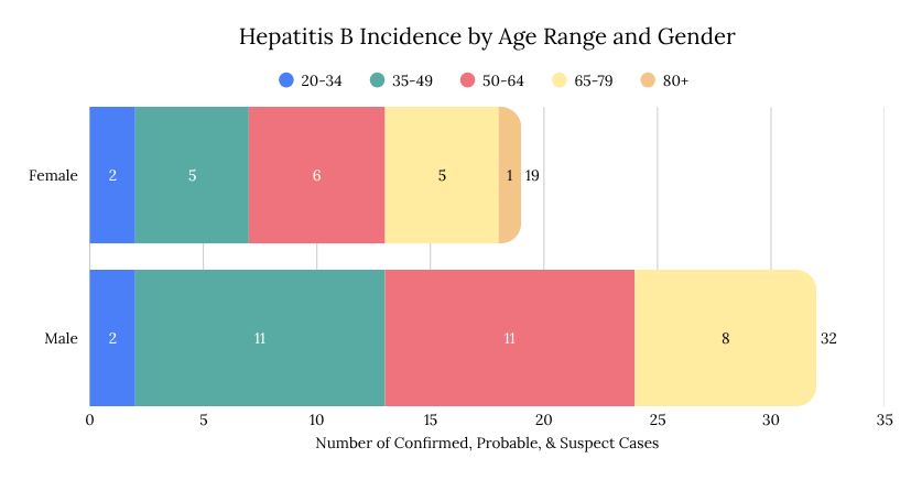 Hepatitis B continues to be the most commonly occurring communicable disease of 2026 (n=51). The majority of all cases have been seen in male individuals aged 35-64 years (43%). This incidence is a 50% decrease from 2025, which saw 102 cases from January 1-March 31. However, Hep B being the highest-incidence communicable disease this winter still indicates a need for increased public health education efforts regarding risk factors and preventative efforts for Hepatitis B contraction.