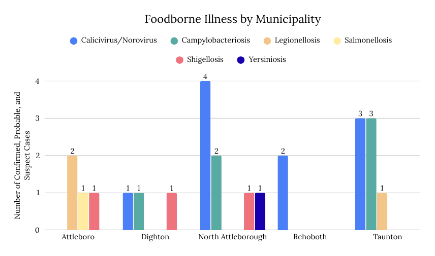 The majority of foodborne diagnoses in 2026 have occurred in North Attleborough residents (n=8), though it must be acknowledged that the exposure may not have necessarily occurred within the municipality. Berkley is the only municipality with zero residents diagnosed with a foodborne illness in 2026.