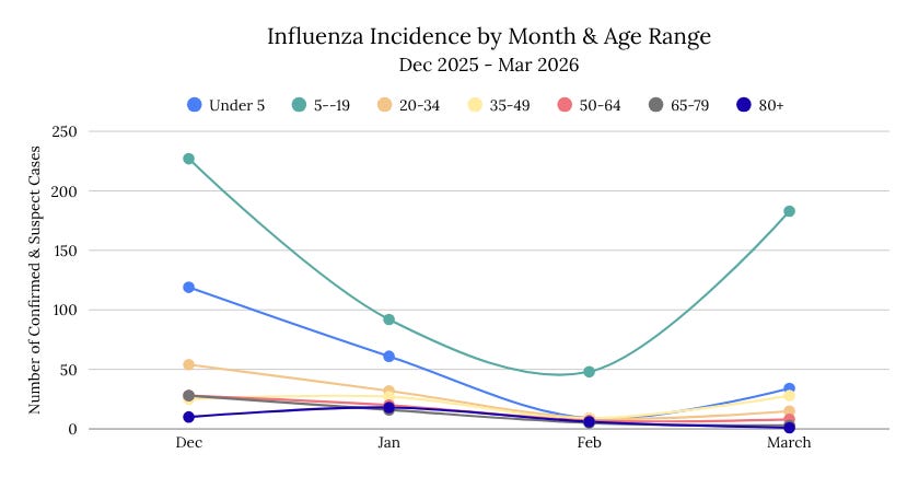After a somewhat quiet February, we saw another jump in flu cases in March (n=272). The majority of these cases were seen in residents aged 5-19 years (67.3%). Among these cases aged 5-19 years, 52% were Taunton residents, 21% were Dighton residents, and 10% were Attleboro residents. This March saw almost twice as many cases as that of 2025, with 145 total confirmed and probable cases. This March spike is not consistent with statewide data, which saw a very slight increase in influenza-like illness hospital visits, but did not see incidence comparable to January.